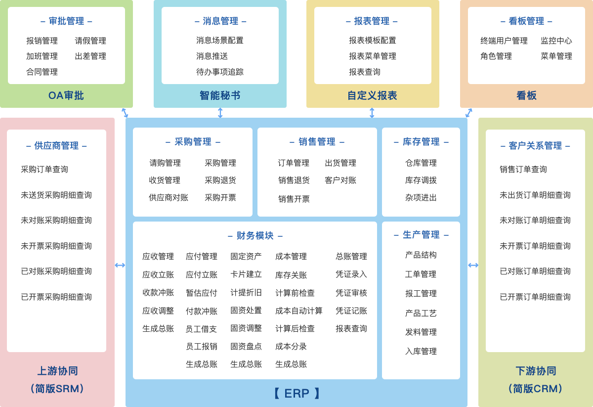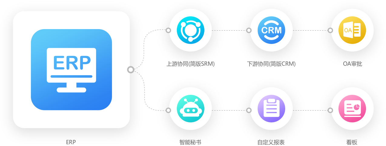 在此基础上,增加了制造业常用的ERP II软件:OA审批、上下游协同、智能秘书、看板、自定义报表;